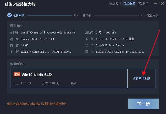 2、选择系统,系统之家装机大师已为您推荐适合电脑配置的系统版本,用户也可选择Win7、Win10或Win11,点击"下一步"。